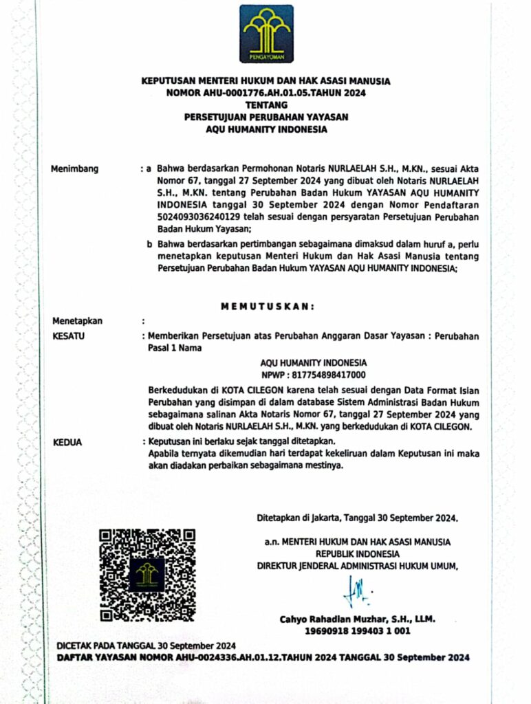 Dalam menjalankan berbagai program tersebut, tentunya AQU Humanity telah mengantongi ijin resmi sebagai yayasan sosial di Jakarta, berikut dokumen legalitas kami: